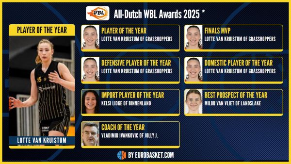 Lotte Van Kruistum, de opvallende small forward van GBI van Dijk Grasshoppers, beleefde een uitzonderlijk seizoen in de Women Basketball League. Ze leidde haar team niet alleen naar de titel met een indrukwekkende 26-1 winst-verliesbalans in de reguliere competitie, maar won ook meerdere individuele prijzen. Van Kruistum werd uitgeroepen tot Speler van het Jaar en won prijzen zoals Finals MVP, Defensive Player of the Year en National Player of the Year.