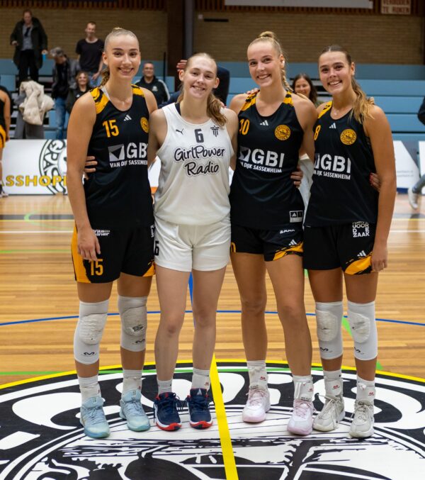 Na afloop poseerden de 4 teamleden die onlangs wereldkampioen werden met het nationale U23 3×3 team. Nu weer tegenstanders. Vlnr: Lotte van Kruistum, Quinta van Schijndel (TTT), Liselot Kulk en Alissa van der Plas.