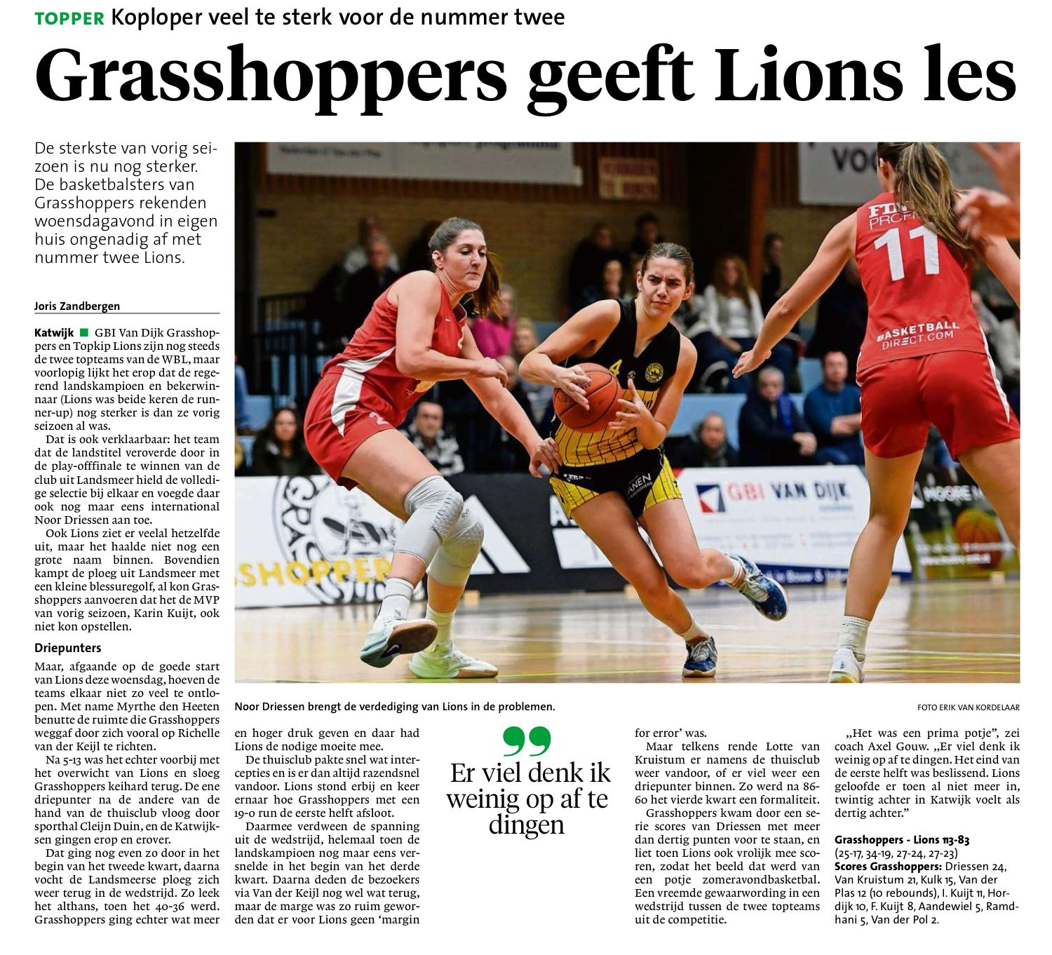 21 november 2024Het was de "Ajax tegen Feijenoord" uit de Woman's Basketball League, GBI van Dijk Grasshoppers vs TopKip Lions. Woensdagavond 20 november stond deze inhaalwedstrijd op het programma. Het werd een monsterscore. 113-83 in het voordeel [...]