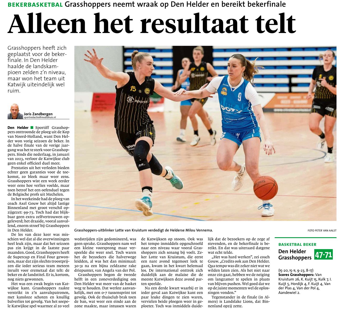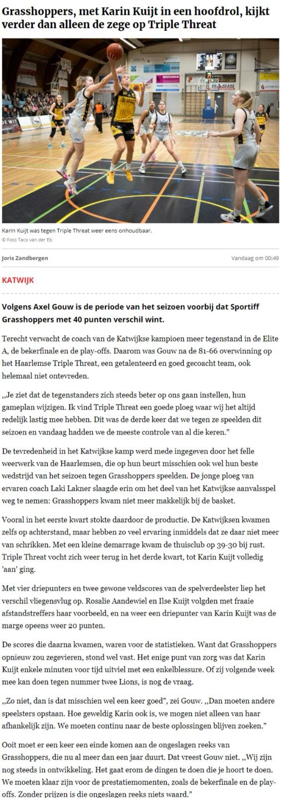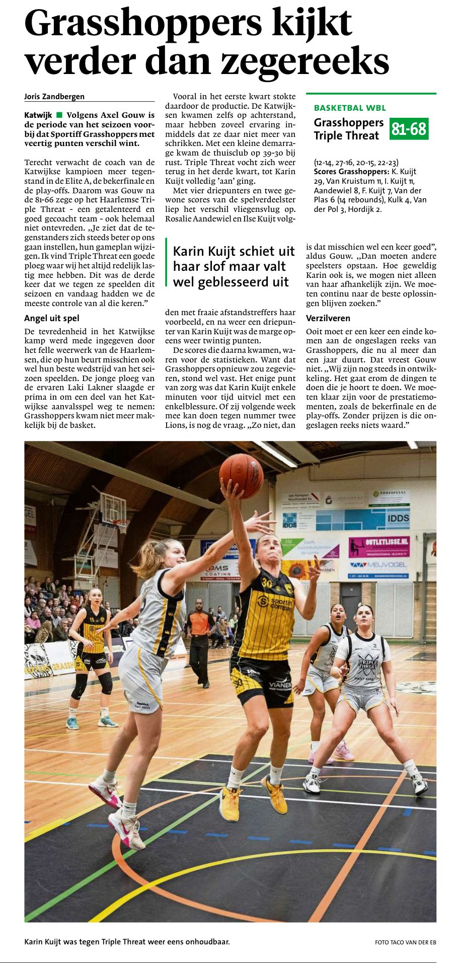 23 februari 2024Zaterdag komt BC Triple ThreaT naar Cleijn Duin. Voor Grasshoppers, uitkomend in de Elite A, de derde thuiswedstrijd achtereen. De laatste gewonnen wedstrijd van de Katwijksen was tegen Startportaal Binnenland. De winst bleef in Katwijk [...]